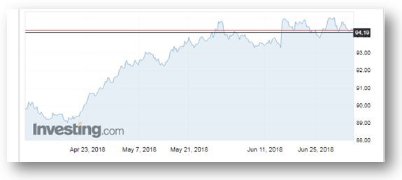 Además del conflicto comercial entre E.UU. y China, ello sería así en gran parte por el comportamiento del dólar respecto a las otras divisas. El dólar se ha fortalecido, desde abril.