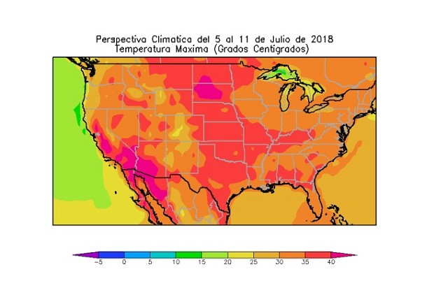 La perspectiva comenzará con vientos del trópico que provocarán una prolongada ola de calor sobre la mayor parte del área agrícola norteamericana. Las precipitaciones se concentrarán sobre la Región Sudeste, siendo escasas sobre la mayor parte del área agrícola norteamericana. Hacia el final de la perspectiva, la llegada de una masa de aire polar poco vigorosa provocará un moderado descenso térmico en el norte del área agrícola norteamericana, mientras que el sur observará valores normales a superiores a lo normal. La evolución del clima mostrará una sucesión de riesgos: Excesivo calor en partes de las Planicies del Norte, las Montañas Rocosas del Norte y la Gran Cuenca del Norte. 6 de Julio; Sequía severa a través de las llanuras centrales, las Montañas Rocosas centrales, el valle inferior del Misisipi, la Gran Cuenca central, las llanuras del norte, la Gran Cuenca del Norte, las Montañas Rocosas del sur, el Valle central del Misisipi, California, las Llanuras meridionales y el sudoeste.