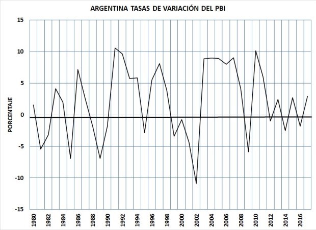 El gráfico muestra las tasas anuales de variación del PBI. Es un sube y baja constante con un claro estancamiento en los últimos 38 años. Todos los intentos por poner orden fiscal formal, licuando el gasto público con devaluaciones y llamaradas inflacionarias, terminaron en un estancamiento de cuatro décadas como mínimo.