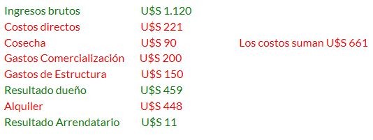 Cuando mencionamos resultado dueño de U$S 459 por hectárea tenemos que detraer los impuestos y tasas viales que se pagan por una hectárea de tierra más los costos de un contador que realice sus declaraciones juradas, que asciende a U$S 100 por hectárea.