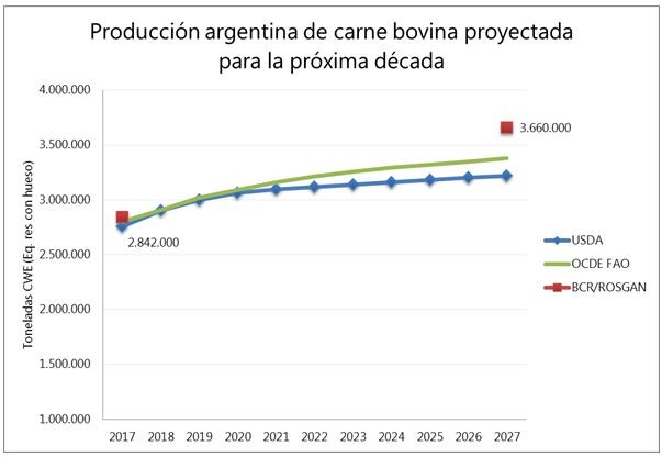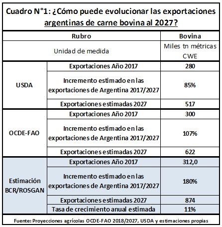 La Bolsa de Comercio de Rosario y ROSGAN, en base a consultas realizadas a operadores y especialistas del sector, consideran que las exportaciones de carne vacuna podrían pasar de 312 mil tn en el año 2017 a 870.000 tn en el 2027. El crecimiento interanual podría ubicarse en el 180%, cifra equivalente al doble del promedio de las estimaciones de la OCDE-FAO y el USDA. La tasa de crecimiento anual acumulativa de las exportaciones (estimada por BCR/ROSGAN) sería del 11%, un valor realmente muy importante. Un verdadero shock positivo de exportaciones.