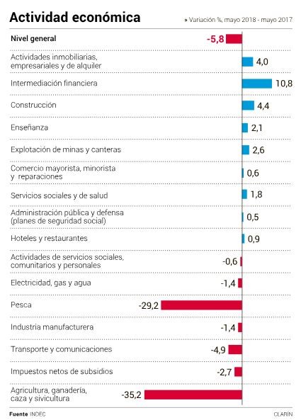 En mayo, por segundo mes consecutivo en el año, cayó el estimador mensual de la actividad económica que releva el Instituto Nacional de Estadística y Censos. Esta vez, la caída fue del 5,8% respecto al mismo mes de 2017, debido al fuerte impacto de la sequía en el sector agropecuario. Aunque también pesó en buena medida, la caída de la industria y la devaluación.