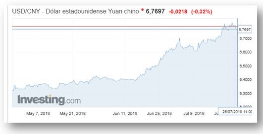 Mientras que el dólar sigue su camino ascendente, tal como lo muestra el cuadro de abajo, el yuan ha bajado a un mínimo de más de 12 meses, al tocar el nivel de 6,83 yuanes por dólar.