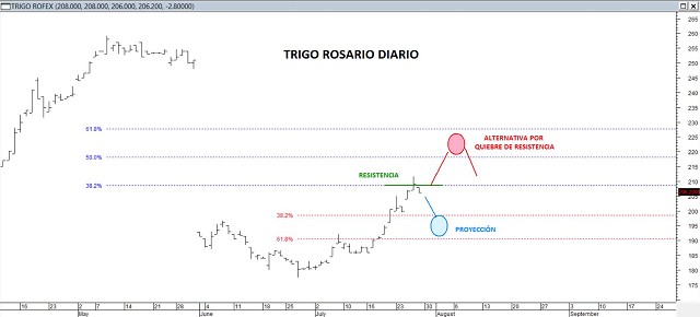 Como se observa en la gráfica, el avance del cereal tiene resistencia clave de corto plazo en la zona de 210 dólares alcanzada. En la medida que esta zona no sea superada, deberemos considerar recortes posibles del precio del trigo hacia instancias de 197-190 dólares para la posición a nueva cosecha.