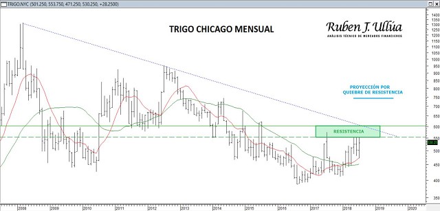 Como se observa en la gráfica adjunta, la zona de máximo alcanzada en torno a los 550-600 centavos es considerada la principal resistencia al avance del cereal. Actualmente se requiere de un quiebre alcista de esta zona para que pueda liberarse un camino de subida mayor hacia adelante, que sea capaz de recortar parcialmente en los próximos meses las fuertes pérdidas sufridas durante todo el bear market (mercado bajista) en fuerza desde el año 2012 e incluso desde el año 2008.
