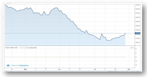 El gráfico que sigue expone claramente cómo, a partir de fines de mayo, el precio FOB Chicago comenzó a decaer. Y también, cómo desde hace unos días, empezó a levantar, más o menos cuando se anunció el principio de acuerdo mencionado.
