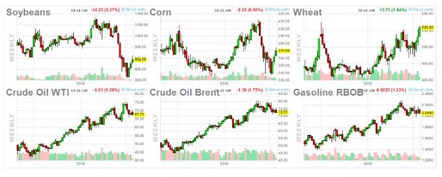 Aqui los gráficos de soja, maíz y trigo de los últimos 12 meses. Petroleo y Gasolina con doble techo