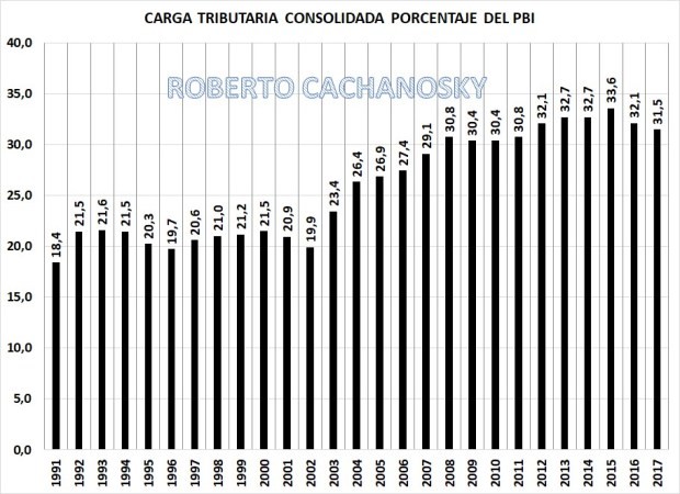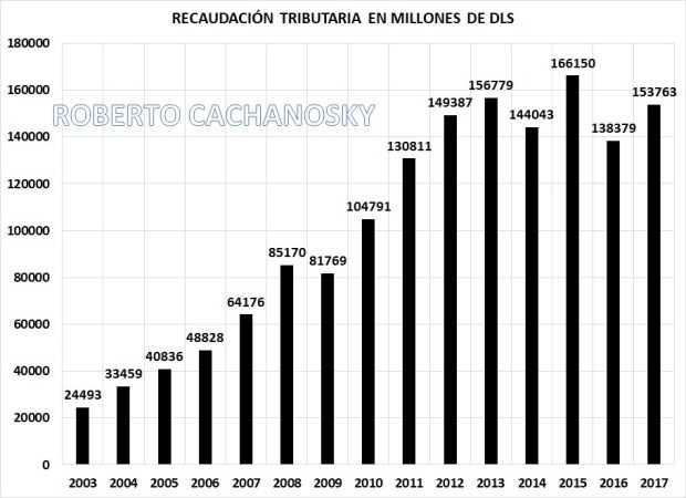 En pesos de 2017 los ingresos tributarios nacionales (IVA, Ganancias, Combustibles, Aportes y Contribuciones, al cheque, etc.) se multiplicaron por 2,5 o aumentaron el 150% en términos reales. Una verdadera masacre tributaria.