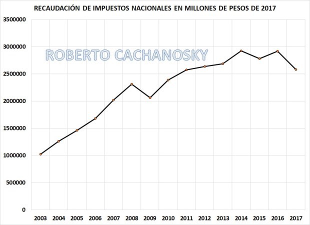Pero veamos un dato más. Cómo evolucionó la recaudación tributaria de los impuestos nacionales entre 2003 y 2017 a pesos de 2017 utilizando IPC para indexar.