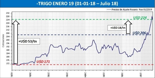 El rumor creciente durante el 2018 fue la escasez de humedad en los países detallados y estos relevantes actores han actuado en consecuencia, comprando en grandes volúmenes en el Mercado de Chicago. En lo que va de 2018 adquirieron, en papeles, la cifra de 24,6 Millones de Toneladas alcanzando la semana pasada la Posición Neta más Comprada desde el 23 de octubre de 2012. Y sólo durante la semana última han adquirido futuros de Trigo por 3,94 Millones de toneladas. Naturalmente todo esto generó una importante escalada en los precios que podemos resumir nuevamente a través de la observación de la curva de la Posición Enero 19 del Mercado a Término de Buenos Aires en el gráfico que sigue.