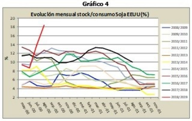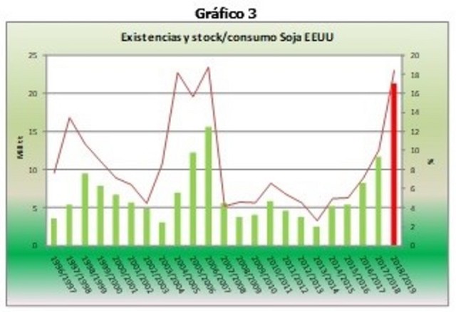 En lo concerniente a los inventarios norteamericanos, las 21.3 mill tt publicadas por USDA (ver gráfico 3 a través de las barras y eje izquierdo) han excedido en 4 mill tt lo proyectado, en tanto que en la evolución mensual el salto ha sido de 5.5 mill tt.