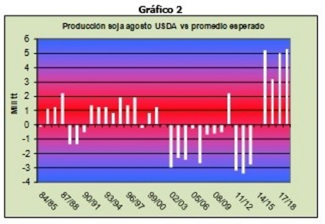 Vale la pena destacar que, al igual que los últimos tres años (y en una magnitud prácticamente similar a la de 2015) el dato informado por USDA en agosto ha sido superior a las previsiones que manejaba el mercado. Tal como lo refleja el gráfico 2 esto implica un vuelco con relación a lo vislumbrado entre 2002 y 2014, cuando en forma recurrente los privados habían sobreestimado el número oficial de producción en agosto.
