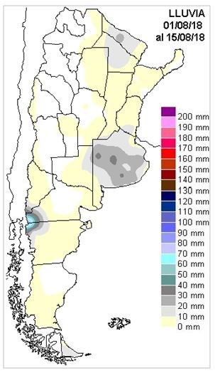 El mes de agosto está cerrando su primera quincena de días con precipitaciones que se generalizaron sobre buena parte de la región pampeana, prevaleciendo registros que estuvieron entre cinco y diez milímetros sobre la franja central, superando esa marca en áreas de BA y LP, extendiéndose con una oferta modesta hacia el norte de la Mesopotamia. En general fueron precipitaciones débiles que se desplegaron en el cambio del martes para el miércoles, las mismas quedan representadas en el mapa.