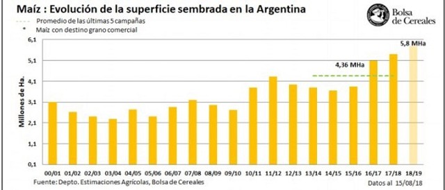 La Bolsa de Cereales de Buenos Aires proyectó que el área destinada a maíz con destino grano comercial (no incluye cifras del maíz destinado forraje) sería récord y alcanzaría las 5.800.000 hectáreas para el ciclo que está a punto de comenzar.