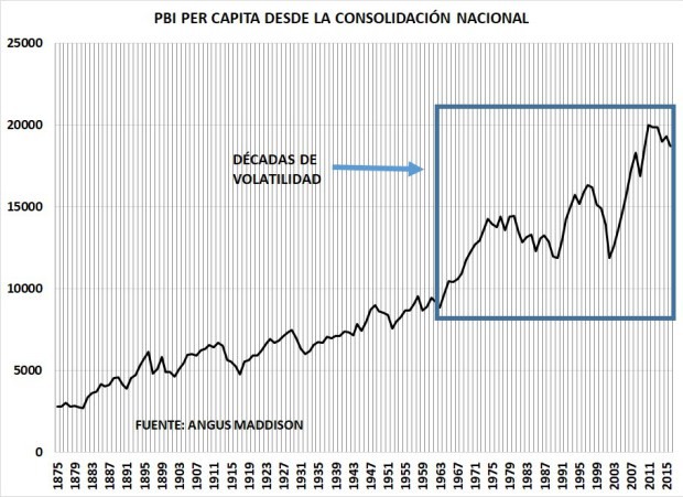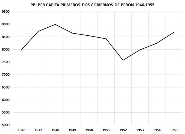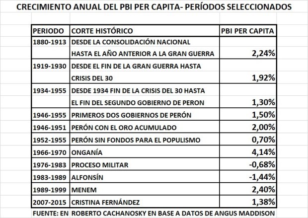 Desde 1880 hasta 1913, el año anterior a la Gran Guerra, el PBI per capita creció a un ritmo del 2,24% anual. Desde el fin de la guerra hasta la crisis del 30 el PBI creció al 1,92% anual. Pero a partir de 1930 dejamos los valores de la Constitución de 1853/60 y entramos en la era intervencionista, proteccionista y populista. Si uno toma desde 1934, fin de la depresión hasta 1955, el crecimiento del PBI per capita fue del 1,5% anual.