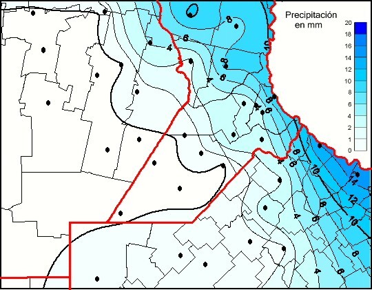 Entre el sábado y domingo pasados, lluvias, chaparrones y tormentas de variada intensidad se recostaron sobre el este de Buenos Aires, Santa Fe, y cubrieron Entre Ríos, donde dejaron las marcas más importantes. En la región central, los mayores acumulados se registraron en Baradero, en Buenos Aires, con 15,2 mm. Le sigue Carlos Pellegrini y Clason, en Santa Fe, con 10,4 mm y 8,6 mm.