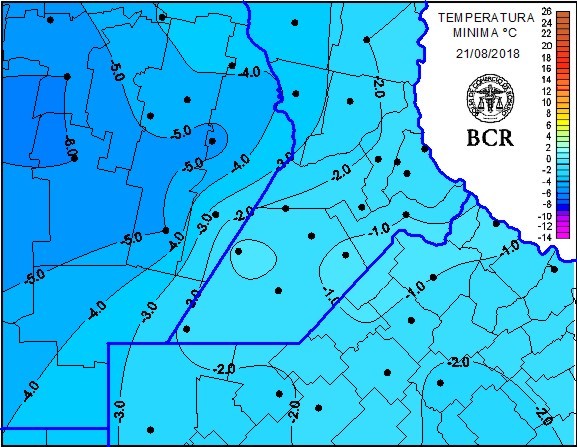 A partir de las 2 de la madrugada de ayer, martes 21 de agosto, los termómetros de Córdoba comenzaron a hundirse por debajo de cero grado. Colonia Almada y Hernando registraron la temperatura mínima más baja con -6 °C; Canals marcó -5,5. En la región núcleo las temperaturas mínimas promediaron los -3 °C.