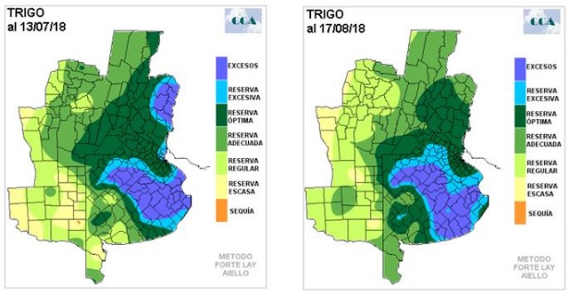 Desde mediados de julio hasta ahora, la marcha en el nivel de reservas para coberturas de trigo, no ha experimentado variantes de importancia, exceptuando la provincia de CB, donde las reservas a gran escala han retrocedido. Tanto julio, como lo que va de agosto, vienen dejando lluvias pobres en la provincia de CB y si bien este es un típico período en el cual la retracción de precipitaciones se hace notar, la oferta de agua no ha sumado esos quince o veinte milímetros que pueden esperarse en estos cuarenta y cinco días. Este comportamiento no había sido muy distinto en junio, con lo cual la provincia mediterránea viene con un invierno bastante seco. El ambientes húmedo ha sido un aliado que pudo hacer menos exigido el tránsito hasta ahora, sin embargo pronto comenzarán a demandarse precipitaciones dado que la zona es la que presenta las reservas más ajustadas.