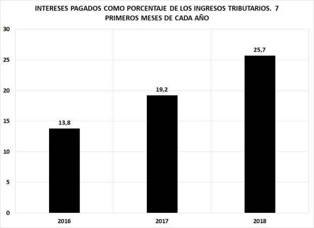 El gráfico 1 muestra el peso de los intereses sobre los ingresos tributario (sin considerar los aportes y contribuciones patronales) en los primeros 7 meses de 2016, 2017 y 2018. Como puede verse, prácticamente se duplicó el peso de los intereses sobre la recaudación. Esto le deja menos margen de maniobra al gobierno para financiar el gasto corriente. De acuerdo a los datos fiscales que viene ofreciendo el gobierno, todo indica que la reducción del déficit fiscal primario queda neutralizado por el peso de los intereses de la deuda que hubo que tomar para financiar este gradualismo, que fue hacer la plancha durante dos años y medio esperando la lluvia de inversiones.