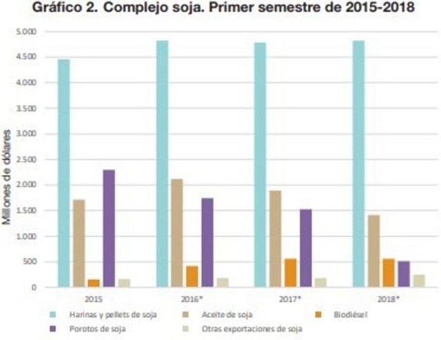 Para comparar, en todo el 2017, la harina de soja había sido el principal producto de exportación, según el Indec. Por detrás, se había ubicado el maíz, y el aceite de soja (englobando tanto el refinado como el bruto) había ocupado el tercer lugar.