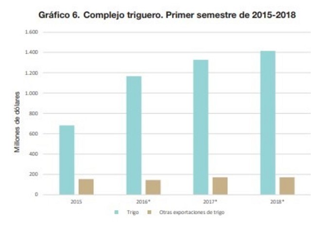 Un sector que también toma relevancia es el triguero, que con aumento de 5,6% al mismo lapso de 2017, alcanzó el 5º lugar con 5,3% de las exportaciones totales. Este sector envió al exterior divisas por U$S 1.585 millones.