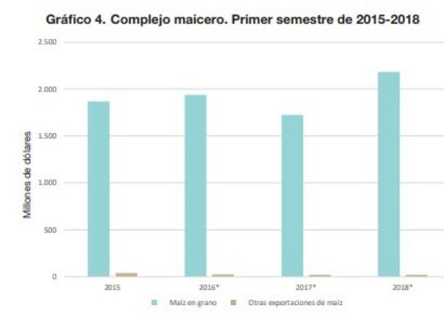 En el caso del sector del maíz, explicó el informe que solo se exporta el grano representando 98,9% de las totales del complejo de este cereal. Los principales destinos fueron: Magreb (sector de África del Norte que comprende los países de Marruecos, Túnez y Argelia), y Egipto con U$S 748 millones de dólares).