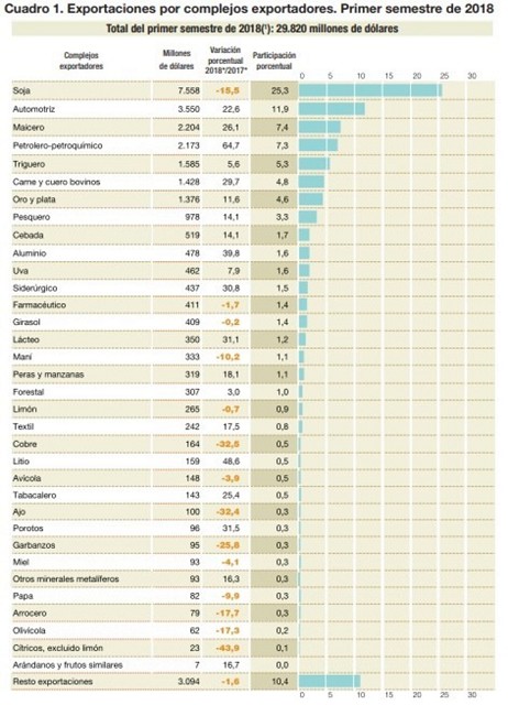 El complejo sojero se encuentra en la cima con 25,3% de las exportaciones totales, alcanzando U$S 7.558 millones. Esto es a pesar que cayó 15,5% en relación al mismo período del año pasado.