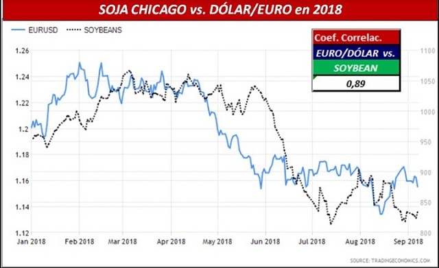 Ahora bien; bajando este efecto a nuestro mundo granario veamos el último gráfico que compara el precio de la soja en el mercado de Chicago con la relación euro/dólar durante 2018.