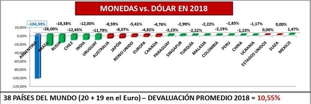 Pero veamos primero los datos, es decir lo sucedido numéricamente con las monedas de 39 países del mundo durante 2018, en realidad de 20 países más el bloque europeo, que involucra otros 19, en el euro. Aclaramos antes que barritas verdes implican países emergentes y las bordó, países desarrollados. Valor negativo implica depreciación de la moneda respectiva frente al dólar y valor positivo apreciación.