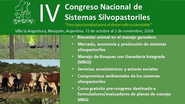 Del 31 de octubre al 2 de noviembre del corriente año se desarrollará en la ciudad de Villa La Angostura, Neuquén, el IV Congreso Nacional de Sistemas Silvopastoriles (www.congresossp2018.com.ar) bajo el lema “Una oportunidad para el desarrollo sustentable”.