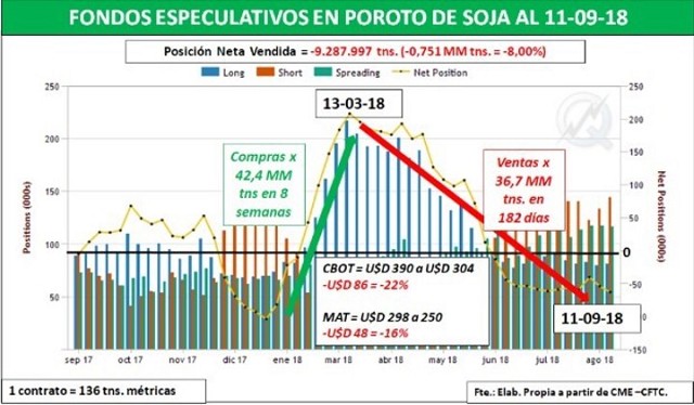 Descripta esta situación en el mundo de grano de soja físico, vayamos a lo más relevante aún; la posición comercial al 11-09-18 de quienes unen nuestro mundo de los granos con el mundo financiero, los famosos “fondos especulativos” o “managed money”. Y es aquí donde se observa el gran impacto sobre los precios. Pongan atención en el siguiente gráfico, sobre la línea amarilla, que muestra la “posición neta” de estos importantes actores del mercado. Posición neta que se reporta semana a semana todos los viernes con datos al martes anterior y que describe el resultado, en toneladas de soja de “todos los fondos que están comprados menos todos los que están vendidos”. Lo importante es observar la dinámica de esa posición neta a lo largo del tiempo. Los carteles que agregamos sobre la curva muestran los fenomenales volúmenes operados en los distintos plazos. Solemos decir que esta curva “cuenta la historia del precio”. Más abajo algunas observaciones y la conclusión.