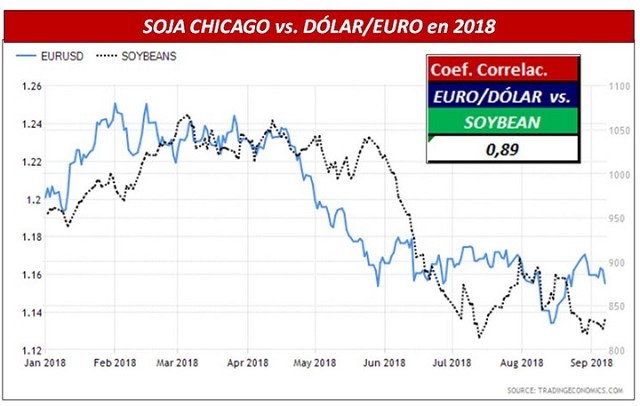 El gráfico que sigue entre “Dólares/Euro” y el “Precio de la Soja en Chicago” nos muestra que se acompañaron en sus variaciones el 89% de las veces en lo que va de 2018.