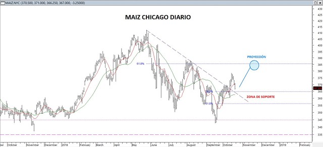 El avance del cereal de las últimas jornadas ha accedido hacia niveles máximos de 378.5 centavos y desde allí vimos el recorte de las últimas sesiones. Las expectativas se inclinan por el desarrollo de una subida mayor, hacia la zona de 385-388 centavos; área donde la recuperación en curso recortaría el 61.8% de toda la baja previa desde los máximos de 412.25 centavos. Más tarde un quiebre alcista de esa zona será necesario para que pueda liberarse un camino de alza mayor, en camino de acceder en el corto plazo de regreso hacia los máximos de mayo pasado en 412 centavos e incluso hacia instancias superiores para adelante.