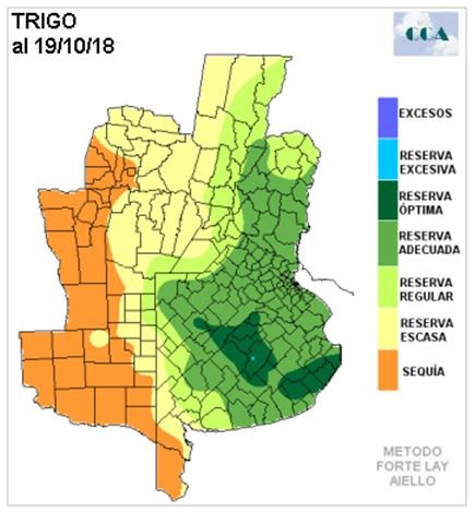 Sobre el núcleo triguero del sur de BA se presenta una situación más holgada, aunque le margen hídrico no se puede considerar una garantía en momentos en que el cultivo comenzará su mayor demanda hídrica. Este aumento de la demanda coincide con un período que no es cubierto por lluvias de buen porte, es decir, no debe sorprender que el mes de octubre cierre deficitario en el sudeste de BA. Las reservas tenderán a ser consumidas en lo que resta del mes, esperando que se concrete un cambio en el patrón pluvial en la transición para el mes de noviembre.