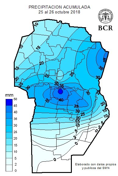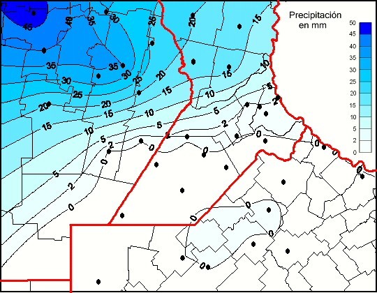 Esta vez, las lluvias abarcaron la porción norte del área núcleo. Por supuesto, las destacadas son las localidades cordobesas del extremo noroeste de la región. Se repiten los registros más importantes de la jornada, como Colonia Almada con 48 mm o Hernando con 40 mm y Bellville 35 mm. En Santa Fe, Carlos Pellegrini registró 20 mm seguida por Classon y Montes de Oca, que midieron 18 mm cada una. El norte bonaerense y el extremo sur de Santa Fe se quedaron, esta vez, sin apuntarse milímetros.