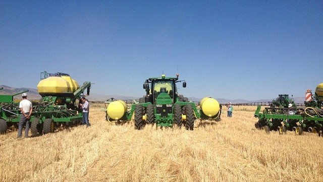 Por otra parte, las otras máquinas ofrecidas por el mercado, con anchos de trabajo similares (por ejemplo 25 m efectivos) y velocidades de trabajo también similares a las de platos, son las fertilizadoras que distribuyen por flujo o corriente de aire (air drill). Su consumo de potencia es bajo y también son de fácil y ágil abastecimiento de tolva, la potencia se transmite desde la toma de fuerza, todos aspectos semejantes a las máquinas de platos.