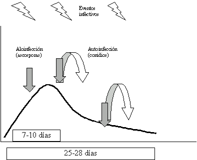 Finalmente, pueden ocurrir epidemias que comparten características de ambos tipos de patrones epidémicos descriptos. El caso de la fusariosis de la espiga es uno de ellos. En esta enfermedad, el sustrato de su agente causal son las anteras. Las anteras son expuestas a partir de inicios de floración alcanzando su exposición total en unos 7 a 10 días. Si durante este período ocurre un evento potencialmente infectivo (precipitaciones, alta humedad relativa por 24 a 48 horas y temperaturas cercanas a los 25 ºC) las ascosporas del hongo causal en restos vegetales son descargadas, pueden alcanzar las anteras, colonizar los filamentos y finalmente infectar los tejidos de la espiga causando los síntomas característicos en unos pocos días (Galich, 2002, Kohli et al., 1996). Si no se vuelven a producir condiciones predisponentes para la infección durante el resto del período en el que las anteras siguen expuestas el patrón epidémico se comporta como monocíclico. Si por el contrario se producen uno o más eventos infectivos posteriores, cuando todavía hay anteras expuestas, las fructificaciones del anamorfo o forma imperfecta del hongo (Fusarium graminearum) pueden inducir infecciones secundarias y hasta terciarias siguiendo un patrón oligocíclico (Figura 3).