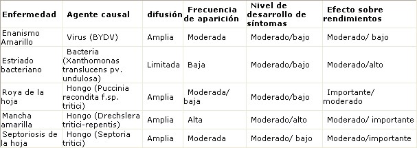 Algunas de las enfermedades foliares y de la espiga de más común ocurrencia en el país son presentadas en los Cuadros 1 y 2, en los que también se caracteriza su importancia relativa.