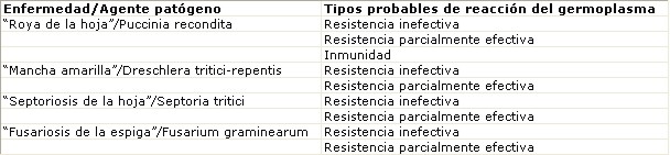 La resistencia es la capacidad que tienen los vegetales para inhibir o limitar el establecimiento de una relación de parasitismo y modula, precisamente, desde la inmunidad o resistencia completa (inhibición total de síntomas) hasta la resistencia parcial o incompleta (limitado y/o lento desarrollo de síntomas). Los tipos probables de reacción de germoplasma para los principales patógenos de trigo son sumarizados en el Cuadro 3.