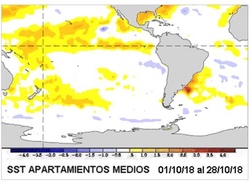 Se destaca el calentamiento que desde las costas bonaerenses se proyecta al litoral Atlántico brasileño. Esta condición térmica suma en el mismo sentido que El Niño a la hora de proyectar un buen desarrollo pluvial para el semestre cálido.