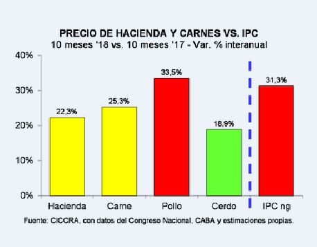 En octubre la carne porcina aumentó 5,8%, contra 1,2% de la vacuna y 0,7% la aviar. En tanto en los últimos seis meses, el precio de la carne aviar subió 40,2%, la vacuna 25,9% y la porcina 25,4%.
