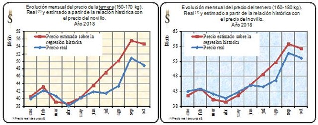 La curva azul representa el precio que efectivamente tuvo el ternero/a en cada mes. La otra corresponde al “estimado mensual” del precio del ternero/a, que surge luego de aplicar las fórmulas que correlacionan los precios de cada mes con el del novillo. Las curvas de precios reales tienen un comportamiento muy parecido hasta el mes de junio, a su comportamiento histórico. A partir de julio el ternero tuvo un precio real 8,5% por debajo de su histórica relación, luego fue de 11,5% y durante los dos últimos meses el ternero estuvo por debajo del 5% de su comportamiento histórico. Aunque si se quisiera ser estrictos, esta diferencia es en realidad mayor debido a los plazos a los que se está comercializando y al costo actual del financiamiento. Si bien este último es un elemento muy importante a la hora de estudiar los comportamientos relativos, los datos históricos solo nos dan precios, y no plazos de pago.