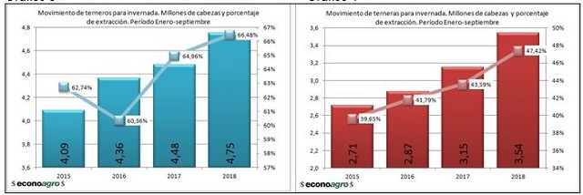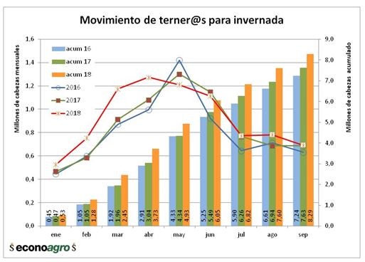 El movimiento nacional de terner@s para invernada tiene un comportamiento marcadamente estacional, el pico máximo ocurre generalmente durante los meses de abril y mayo, mientras que el mínimo suele darse en noviembre.