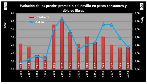 En el gráfico 1 se muestran los promedios anuales del novillo en pesos constantes y en dólares libres. Los valores del 2018 corresponden al promedio de los primeros 10 meses del año.