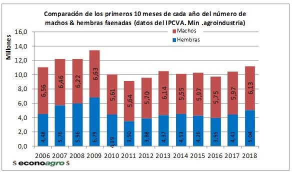 Durante los primeros 10 meses del 2018 se faenaron 11,17 millones de cabezas. El