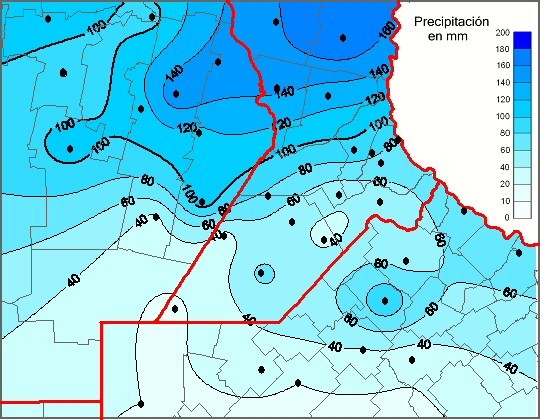 Gran parte de la porción norte de la región central quedó con registros de lluvias por encima de los 100 mm. En las últimas 72 horas, hasta las 8 de la mañana se llevaban medidos 180 mm en Irigoyen, 158 mm en Carlos Pellegrini en la provincia de Santa Fe. Les siguen en orden de importancia los registros de las localidades cordobesas de Bellville con 156 mm y Noetinger con 148 mm.