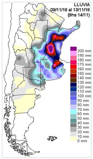 En el mapa se resumen las precipitaciones observadas desde el viernes pasado hasta las 9hs de hoy. Los acumulados pluviales fueron excesivos en general para un período tan corto de tiempo, pero dentro de este contexto se destacan áreas donde los mismos fueron record. El centro oeste entrerriano y las vecindades de SF, con más de 250 milímetros, encabezan este comportamiento. Sin embargo hay muchas localidades donde se observaron episodios de tiempo severo, con más de 150 milímetros caídos al cabo de menos de doce horas. Las localidades de Saladillo en BA, Reconquista en SF, Mercedes en Corrientes, son solo algunos ejemplos. Seguramente dentro del área donde quedan coloreadas las lluvias superiores a los 130 milímetros, pueden contarse casos similares. En la zona triguera del sur de BA, la provisión de agua fue importante pero no tan significativa como en el norte y, aunque igualmente son acumulados que exceden los valores normales para un período corto de tiempo, la recarga no ha sido dañina, es decir no ha provocado los anegamientos temporarios que se han generado en zonas trigueras del centro del país.