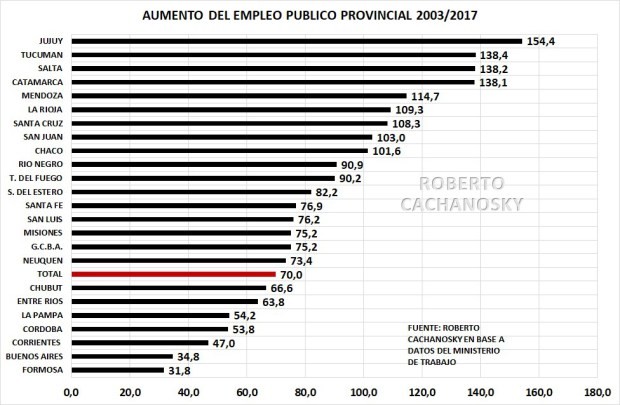 De los 24 distritos considerados, solo siete crecieron por debajo del promedio general, y en casos como Formosa, el empleo público no creció más, probablemente porque ya no quedaba mucha más gente para agregar al estado provincial.