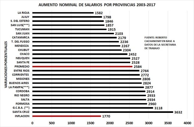 En promedio, las provincias aumentaron el salario promedio de los empleados públicos un 2.584% entre 2003 y 2017 contra una inflación que estuvo en el 1.770%. La única provincia que estuvo por debajo de la tasa de inflación fue La Rioja.