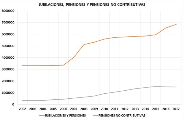 Junto al aumento del empleo público provincial, dupliquemos la cantidad de jubilados y pensionados llevándolos de 3,3 millones a 6,8 millones de beneficiarios, multipliquemos por 4,5 los beneficiarios de pensiones no contributivas (pensiones truchas por invalidez, madres con más de 7 hijos, pensiones graciables, etc.), condimentémoslo con 3,9 millones de beneficiarios de AUH, por citar solo algunos ejemplos de gente que vive del trabajo de los pocos que producimos, y no hay bolsillo del contribuyente que aguante semejante despilfarro de recursos en nombre de la solidaridad social.